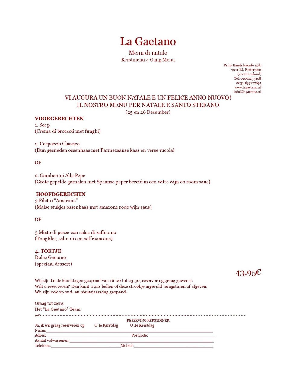 Van harte welkom op de website van Restaurant Pizzeria La Gaetano. Leuk dat u dit plekje op internet heeft gevonden. Deze website is bedoeld als een uitgebreid visitekaartje voor een ander plekje, een plekje waar verschillende dingen één ding gemeen hebben Italië: Italiaanse pizza's, Italiaanse pasta's, Italiaanse gastvrijheid, Italiaanse sfeer, Italiaanse kok, Italiaanse dranken. Wij als Italiaanse eigenaren doen zeven dagen per week ons best om u tot de volgende conclusie te laten komen: "Restaurant Pizzeria La Gaetano is een klein stukje Italië midden in de bruisende stad Rotterdam."
